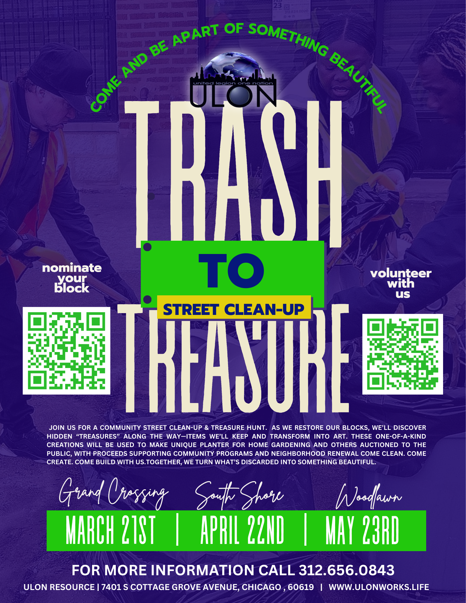 Join ULON's Trash to Treasure Reimagined Art Campaign, where our mission is to bring together people from all over Chicago, including former incarcerated individuals, for a noble cause. Our goal is to extend the power of upcycling and reveal the true significance of the well-known phrase, "One man's trash is another man's treasure."